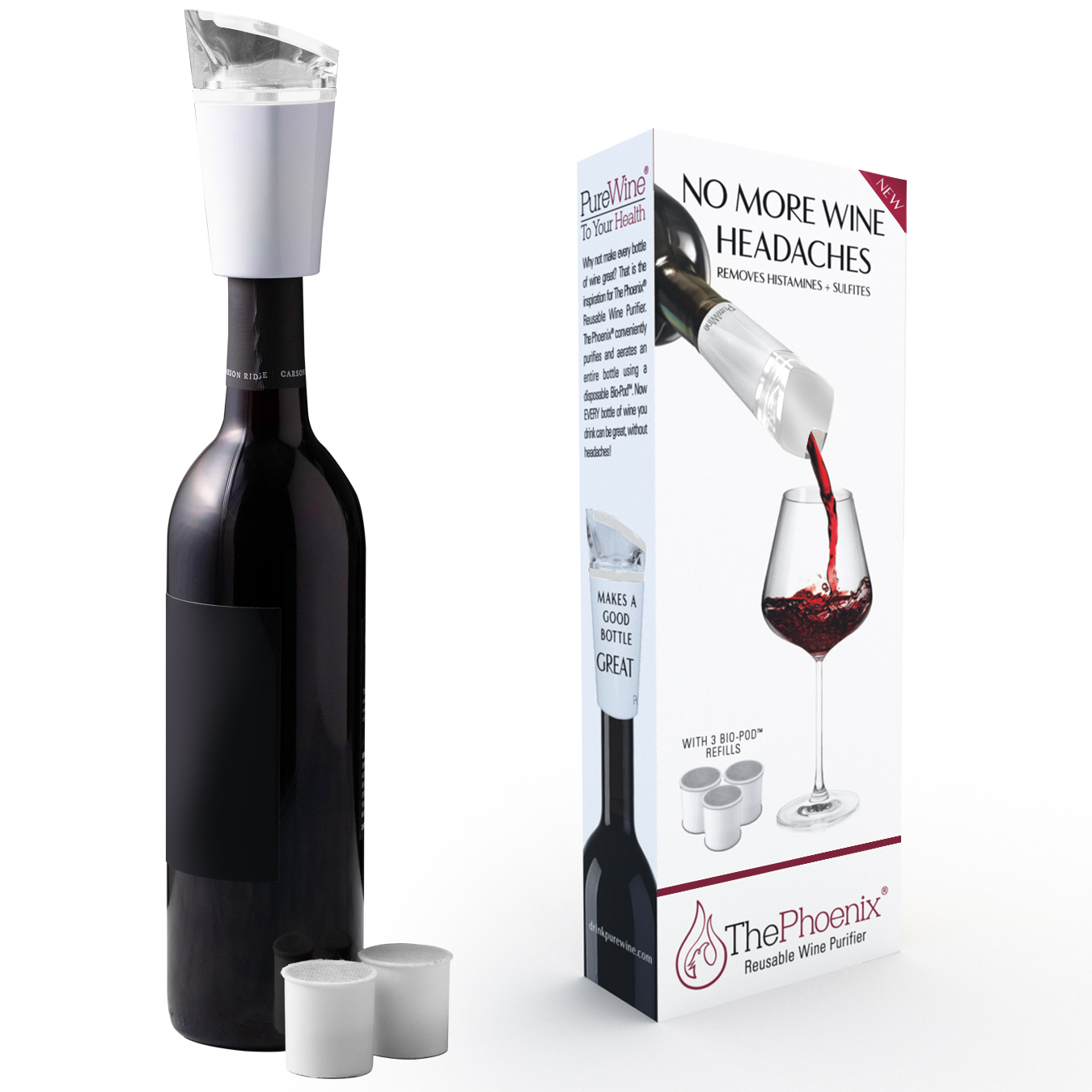 The Phoenix® is the only reusable wine purifier and aerator to remove both histamines and sulfites from wine as you pour. Alleviates wine headaches, stuffy nose, skin flushing and next-day hangovers.
